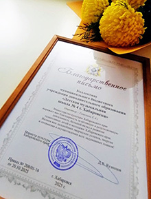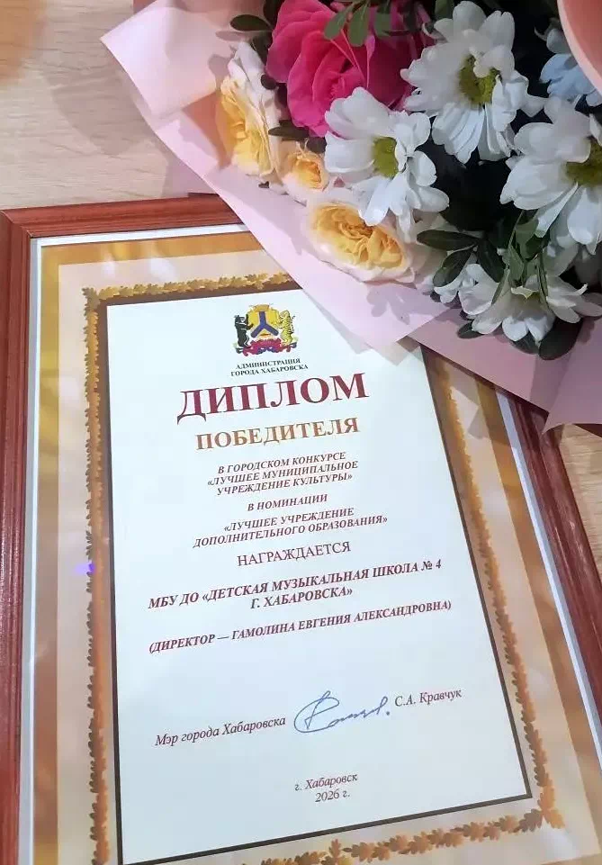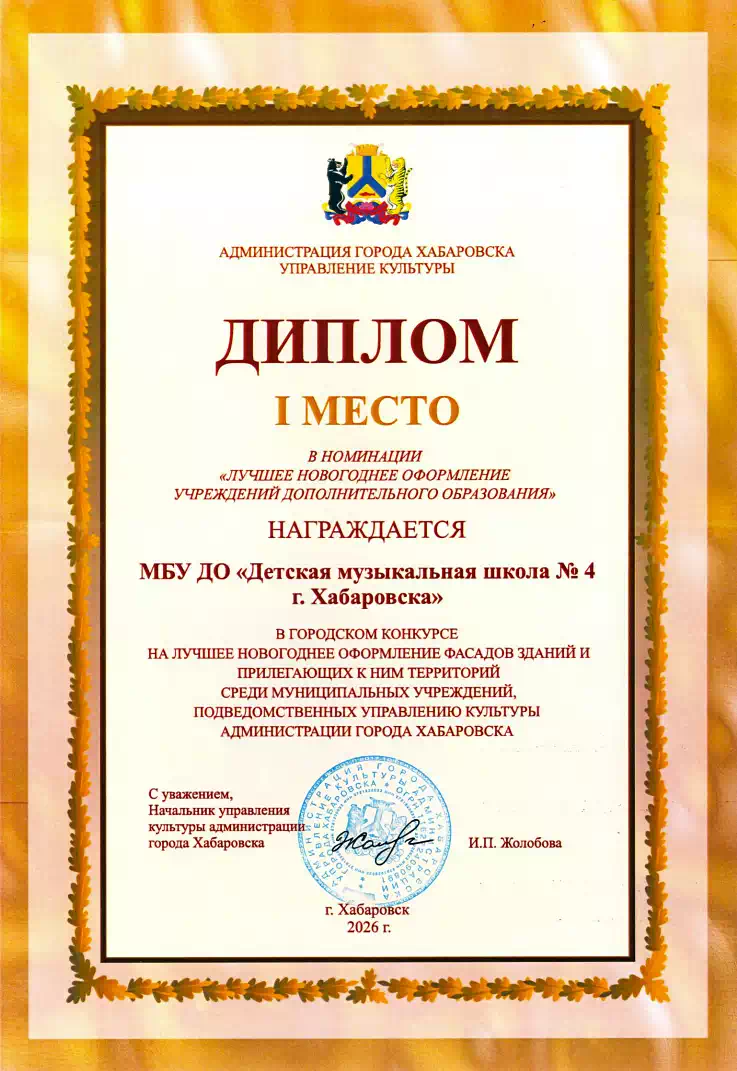 28.01.2026. Наша школа заняла первое место в городском конкурсе на лучшее новогоднее оформление фасадов зданий и прилегающих к ним территорий среди муниципальных учреждений, подведомственных Управлению культуры Администрации города Хабаровска.